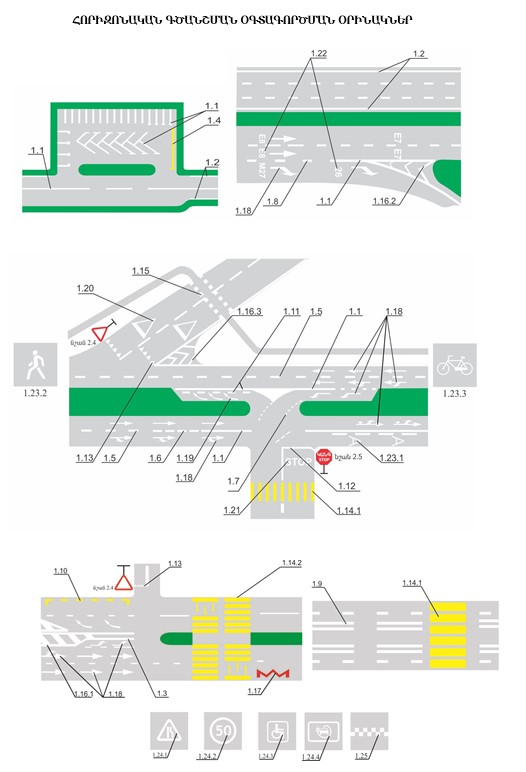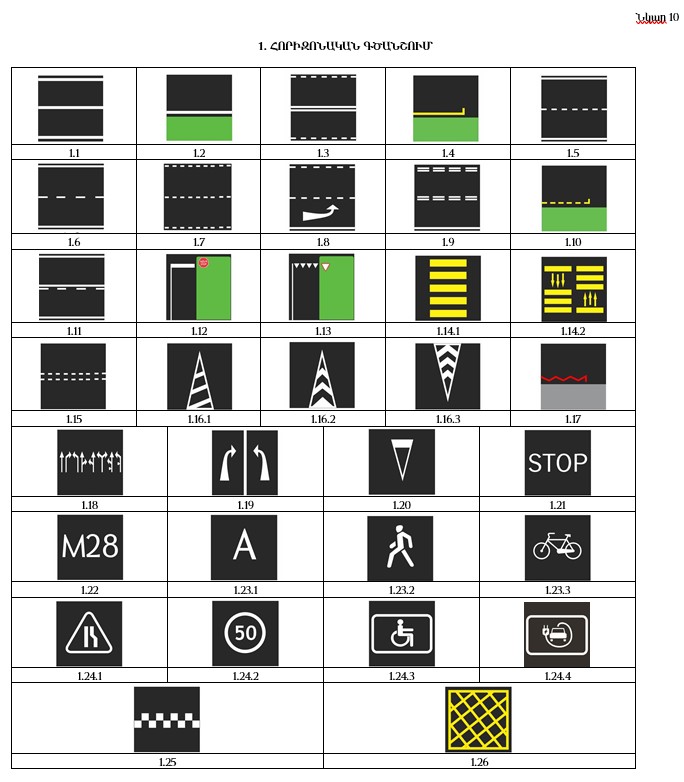 «1.26 (գույնը՝ դեղին)՝ նշում է խաչմերուկի հատվածը, որտեղ արգելվում է մուտք գործել, եթե առջևում՝ երթևեկության ուղղությամբ առաջացել է խցանում, որը վարորդին կհարկադրի կանգ առնել` խոչընդոտ ստեղծելով հատող ճանապարհով լայնական ուղղությամբ տրանսպորտային միջոցների երթևեկության համար, բացառությամբ սույն Կանոններով սահմանված՝ աջ կամ ձախ շրջադարձ կատարելու դեպքերի: Կիրառվում է ինքնուրույն կամ 1.35` «Խաչմերուկի տարածք» նշանի հետ:»,