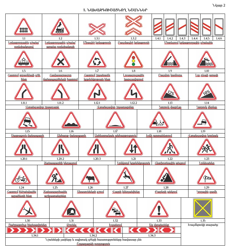 «1.35 նշանը տեղադրվում է խաչմերուկի սահմանին: Եթե բարդ խաչմերուկներում հնարավոր չէ ճանապարհային նշանը տեղադրել խաչմերուկի սահմանին, ապա այն տեղադրում են խաչմերուկի սահմանից ոչ ավել, քան 30 մ հեռավորության վրա:»,