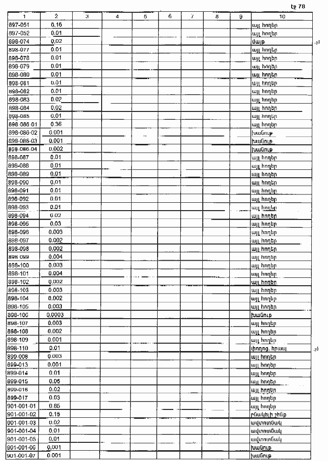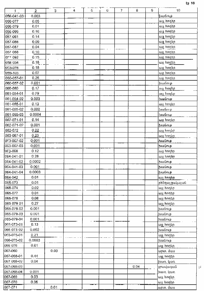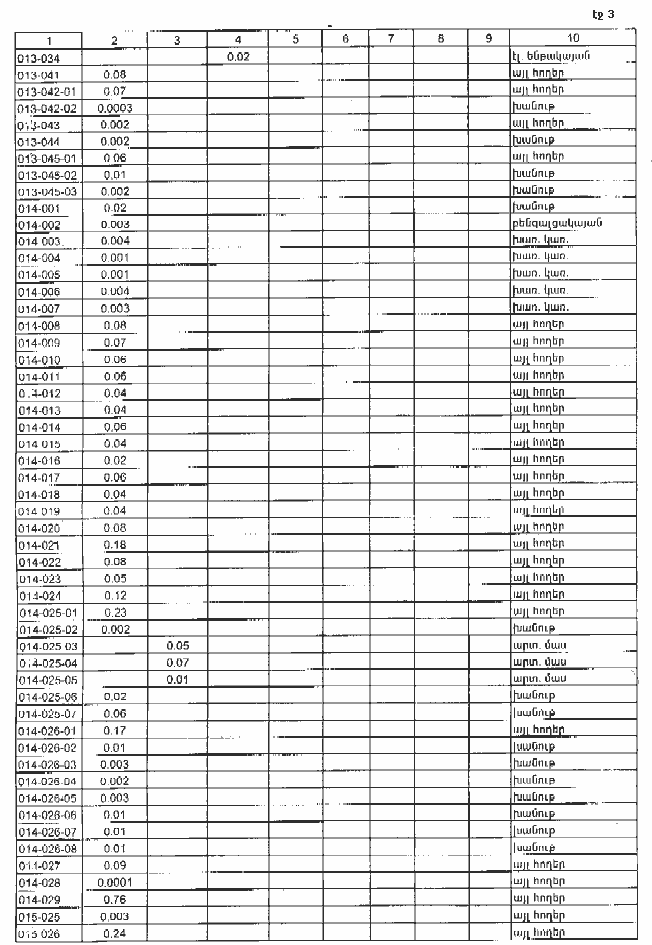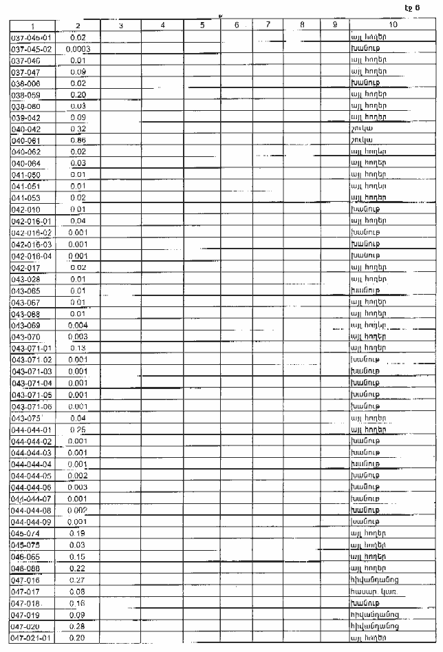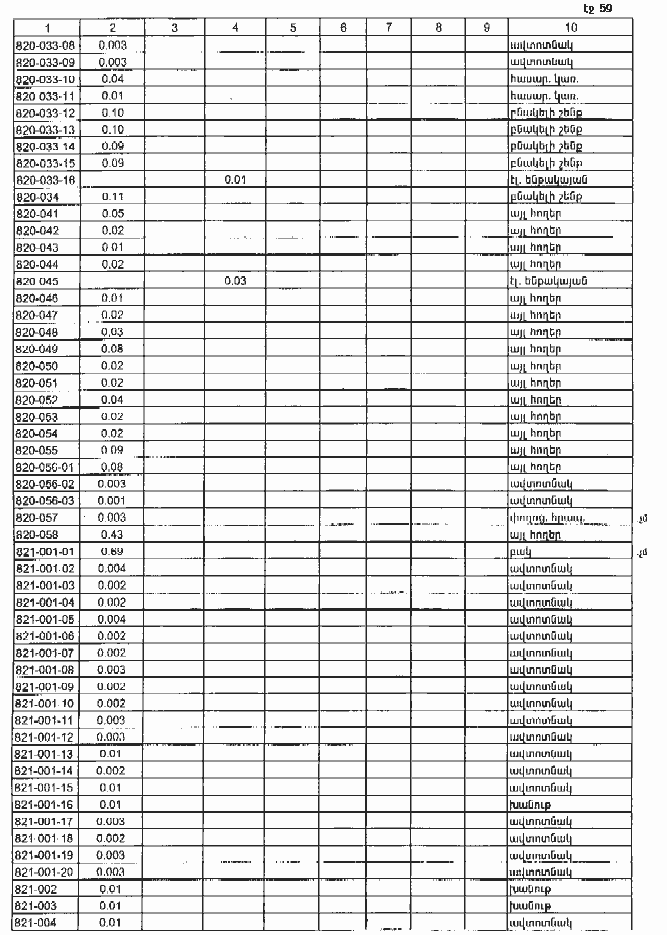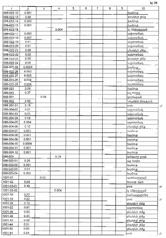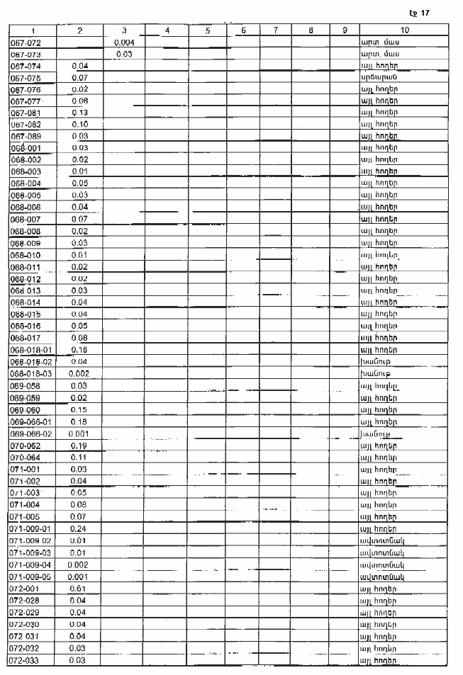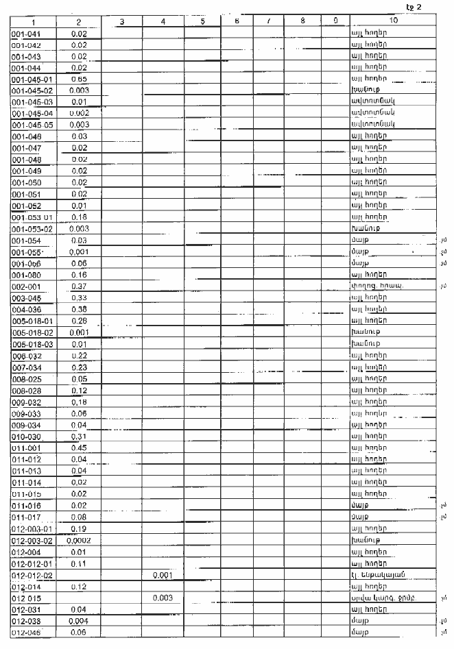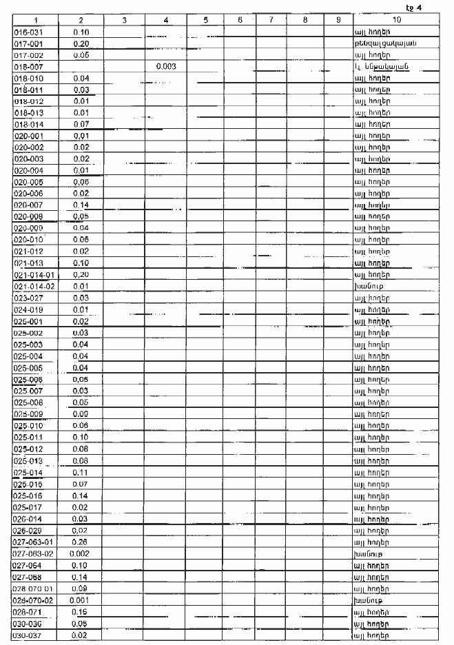 NN Նպա- Գործառական Ընդամենը Սեփականության սուբյեկտը ՀՀ քաղա- ՀՀ իրա- համայն- պետա- օտար- Ա Բ Գ 1 2 3 4 5 6 1.1 1. Գյուղա- վարելահող 2333.99 1925.87 282.90 125.22 1.2 բազմամյա տնկարկներ, 170.12 170.12 0.00 1.2.1 այդ թվում` 21.73 21.73 1.2.2 խաղողի այգի 148.39 148.39 1.2.3 այլ 1.3 խոտհարք 0.00 1.4 արոտ 1.5 այլ հողատեսքեր 1 ընդամենը 2504.11 2095.99 282.90 125.22 2.1 2. Բնակա- բնակելի կառուցապատման 430.00 430.00 2.1.1 այդ թվում` տնամերձ հողեր 430.00 430.00 2.1.2 այգեգործական 2.2 ընդհանուր օգտագործման 2.3 այլ հողեր 2 ընդամենը (2.1+2.2+2.3) 430.00 430.00 3 3. Արդյունաբերության, ընդերքօգտագործման և այլ 4 4. Էներգետիկայի, տրանսպորտի, կապի և կոմունալ ենթակառուցվածքների օբյեկտների 5 5. Հատուկ պահպանվող տարածքների 6 6. Հատուկ նշանակության 7.1 7. Անտառային անտառ 7.2 թփուտ 7.3 վարելահող 7.4 խոտհարք 7.5 արոտ 7.6 այլ հողեր 7 ընդամենը 8 8. Ջրային 9 9. Պահուստային ԸՆԴԱՄԵՆԸ` ՈՌՈԳՎՈՂ ՀՈՂԵՐ 2934.11 2525.99 282.90 125.22