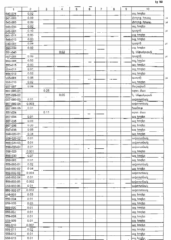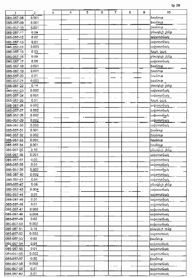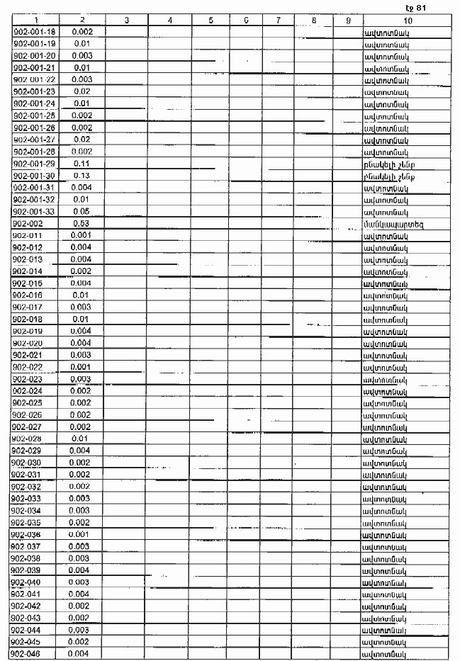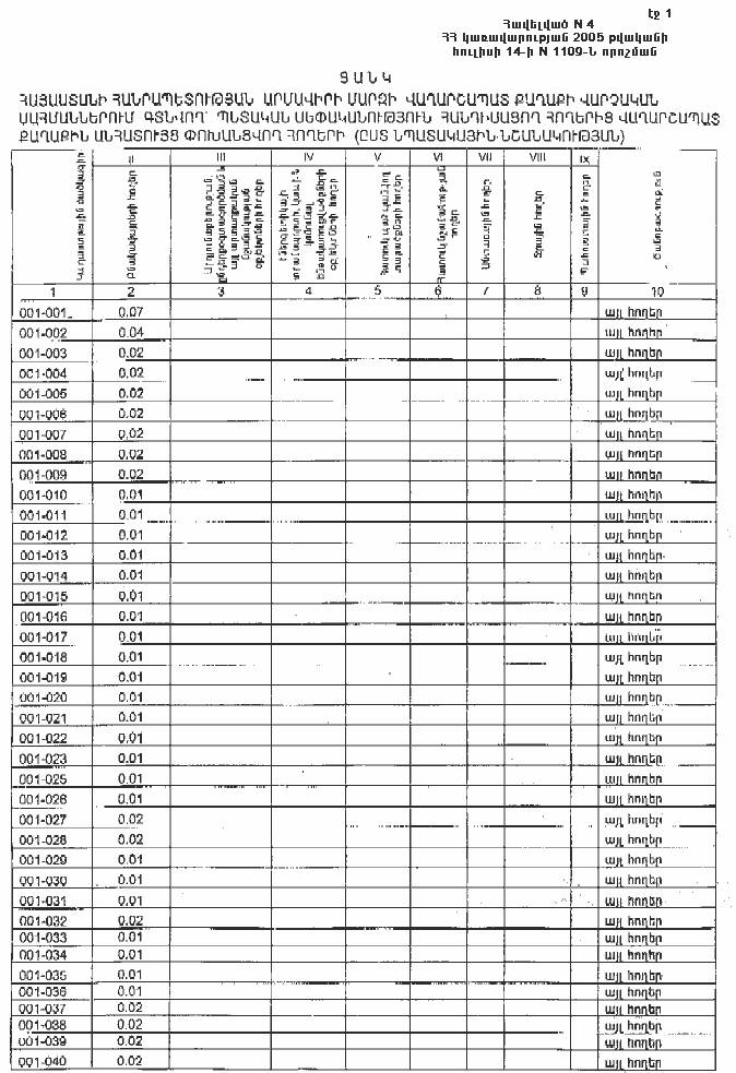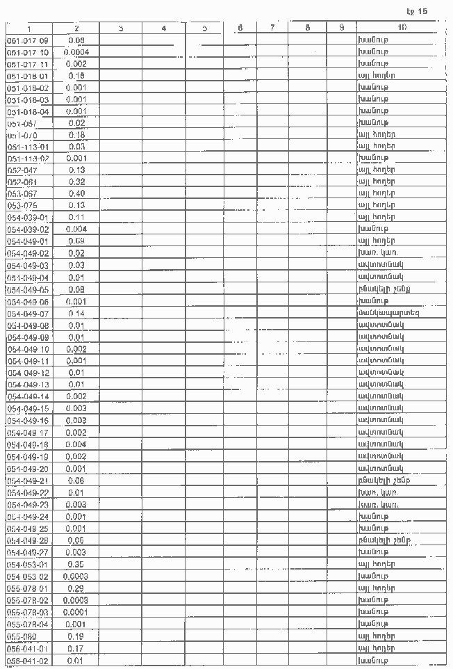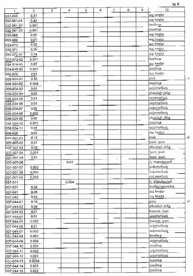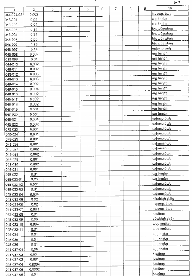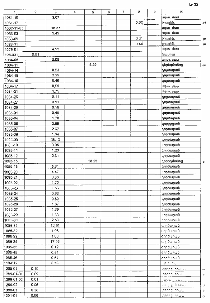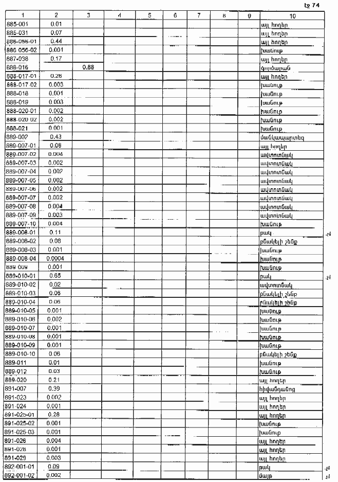 NN Նպա- Գործառական Ընդամենը Սեփականության սուբյեկտը ՀՀ քաղա- ՀՀ իրա- համայն- պետա- օտար- Ա Բ Գ 1 2 3 4 5 6 1.1 1. Գյուղա- վարելահող 2333.99 1925.87 282.90 125.22 1.2 բազմամյա տնկարկներ, 170.12 170.12 0.00 1.2.1 այդ թվում` 21.73 21.73 1.2.2 խաղողի այգի 148.39 148.39 1.2.3 այլ 1.3 խոտհարք 0.00 1.4 արոտ 1.5 այլ հողատեսքեր 1 ընդամենը 2504.11 2095.99 282.90 125.22 2.1 2. Բնակա- բնակելի կառուցապատման 430.00 430.00 2.1.1 այդ թվում` տնամերձ հողեր 430.00 430.00 2.1.2 այգեգործական 2.2 ընդհանուր օգտագործման 2.3 այլ հողեր 2 ընդամենը (2.1+2.2+2.3) 430.00 430.00 3 3. Արդյունաբերության, ընդերքօգտագործման և այլ 4 4. Էներգետիկայի, տրանսպորտի, կապի և կոմունալ ենթակառուցվածքների օբյեկտների 5 5. Հատուկ պահպանվող տարածքների 6 6. Հատուկ նշանակության 7.1 7. Անտառային անտառ 7.2 թփուտ 7.3 վարելահող 7.4 խոտհարք 7.5 արոտ 7.6 այլ հողեր 7 ընդամենը 8 8. Ջրային 9 9. Պահուստային ԸՆԴԱՄԵՆԸ` ՈՌՈԳՎՈՂ ՀՈՂԵՐ 2934.11 2525.99 282.90 125.22