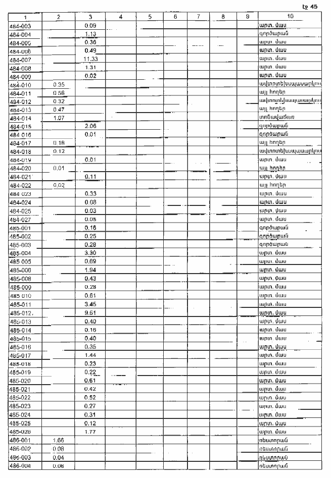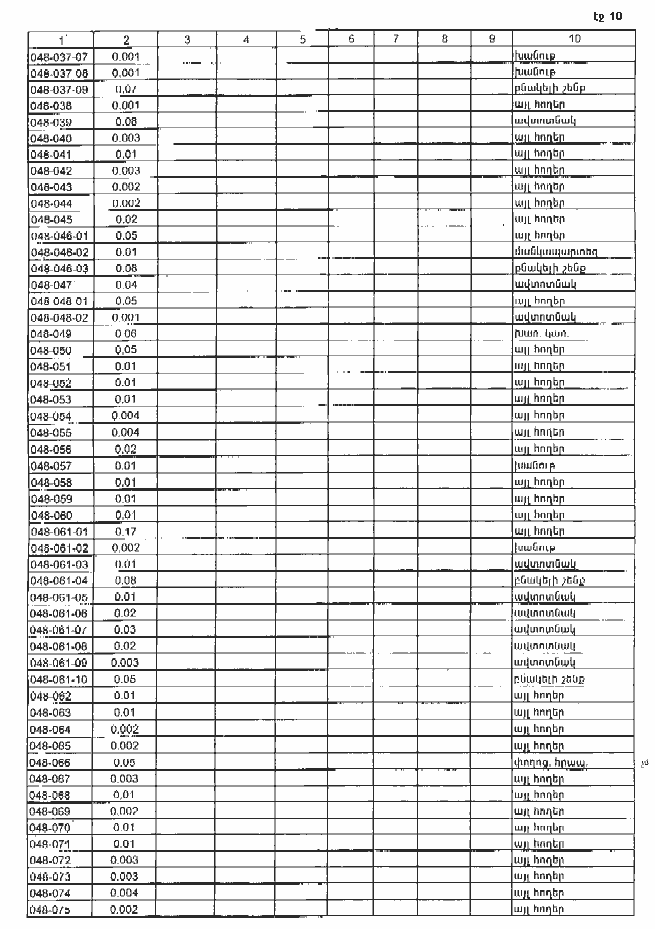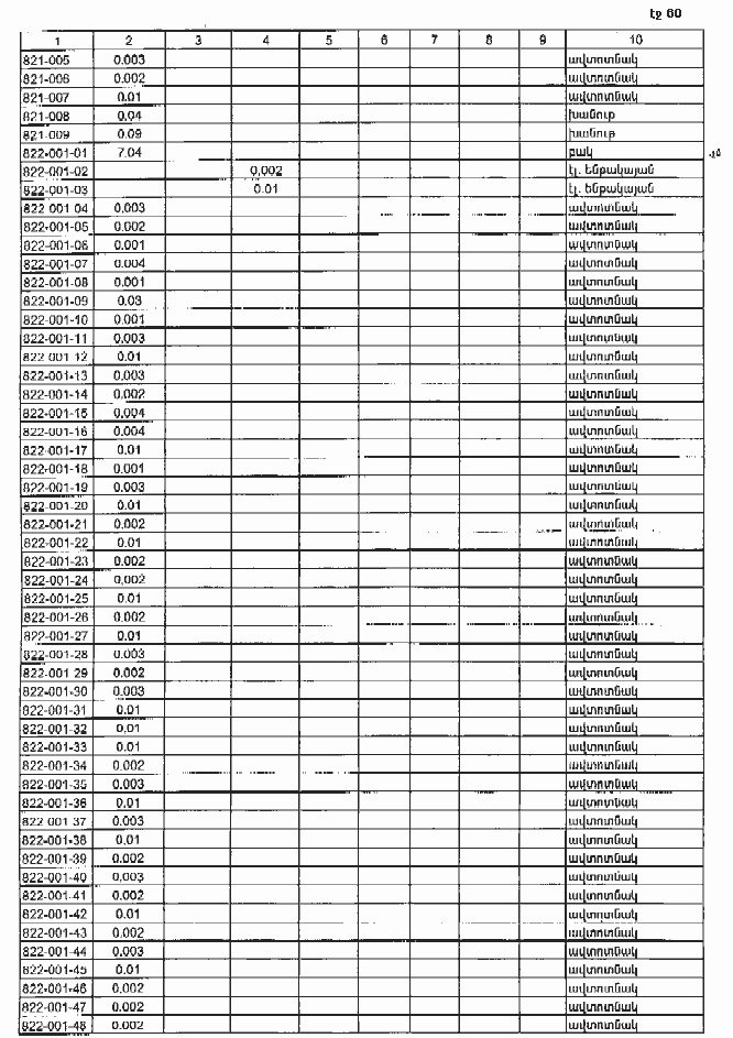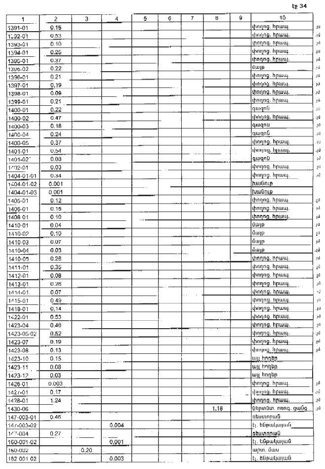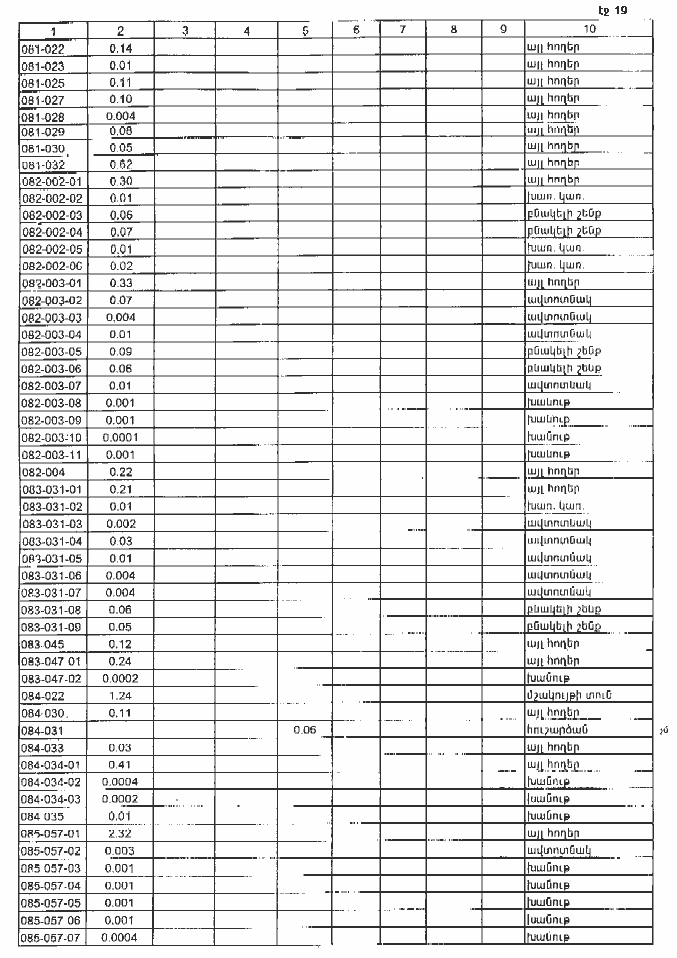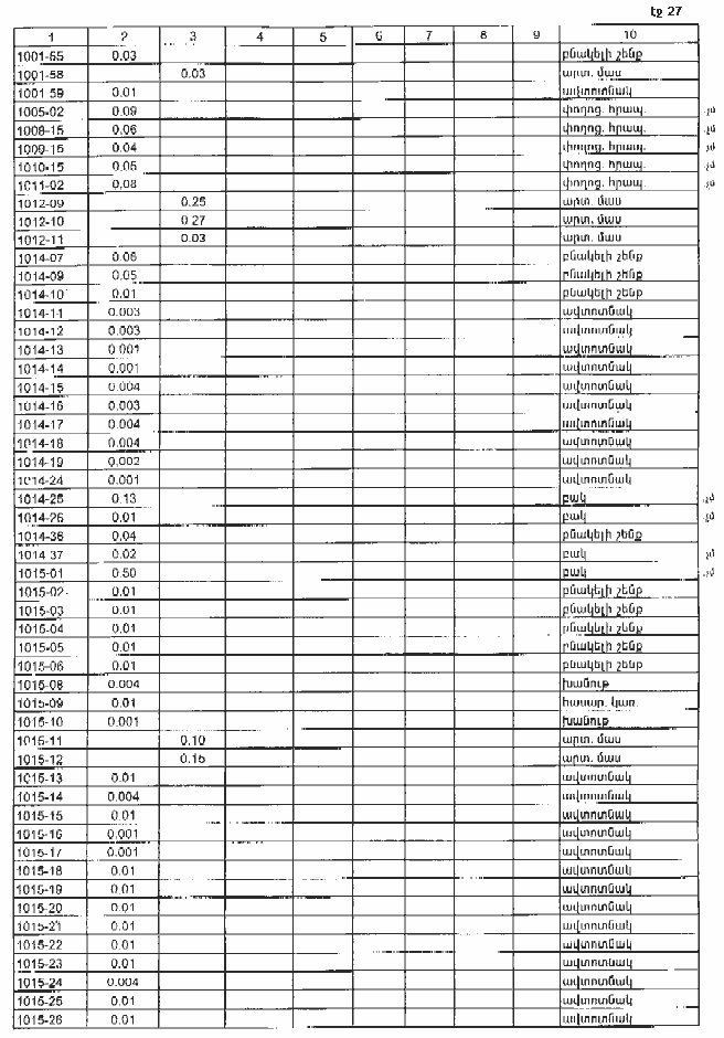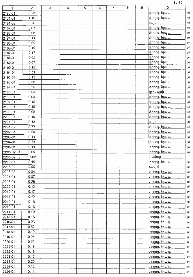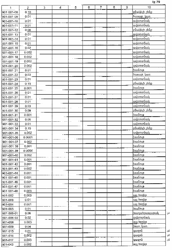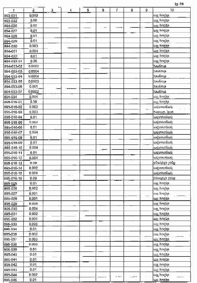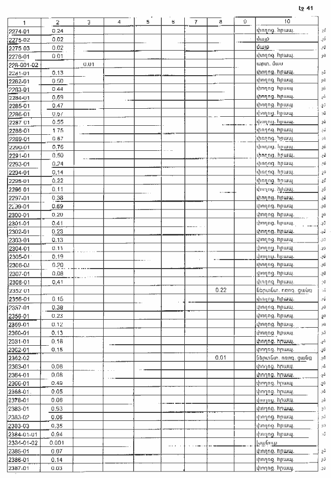 NN Նպա- Գործառական Ընդամենը Սեփականության սուբյեկտը ՀՀ քաղա- ՀՀ իրա- համայն- պետա- օտար- Ա Բ Գ 1 2 3 4 5 6 1.1 1. Գյուղա- վարելահող 2333.99 1925.87 282.90 125.22 1.2 բազմամյա տնկարկներ, 170.12 170.12 0.00 1.2.1 այդ թվում` 21.73 21.73 1.2.2 խաղողի այգի 148.39 148.39 1.2.3 այլ 1.3 խոտհարք 0.00 1.4 արոտ 1.5 այլ հողատեսքեր 1 ընդամենը 2504.11 2095.99 282.90 125.22 2.1 2. Բնակա- բնակելի կառուցապատման 430.00 430.00 2.1.1 այդ թվում` տնամերձ հողեր 430.00 430.00 2.1.2 այգեգործական 2.2 ընդհանուր օգտագործման 2.3 այլ հողեր 2 ընդամենը (2.1+2.2+2.3) 430.00 430.00 3 3. Արդյունաբերության, ընդերքօգտագործման և այլ 4 4. Էներգետիկայի, տրանսպորտի, կապի և կոմունալ ենթակառուցվածքների օբյեկտների 5 5. Հատուկ պահպանվող տարածքների 6 6. Հատուկ նշանակության 7.1 7. Անտառային անտառ 7.2 թփուտ 7.3 վարելահող 7.4 խոտհարք 7.5 արոտ 7.6 այլ հողեր 7 ընդամենը 8 8. Ջրային 9 9. Պահուստային ԸՆԴԱՄԵՆԸ` ՈՌՈԳՎՈՂ ՀՈՂԵՐ 2934.11 2525.99 282.90 125.22