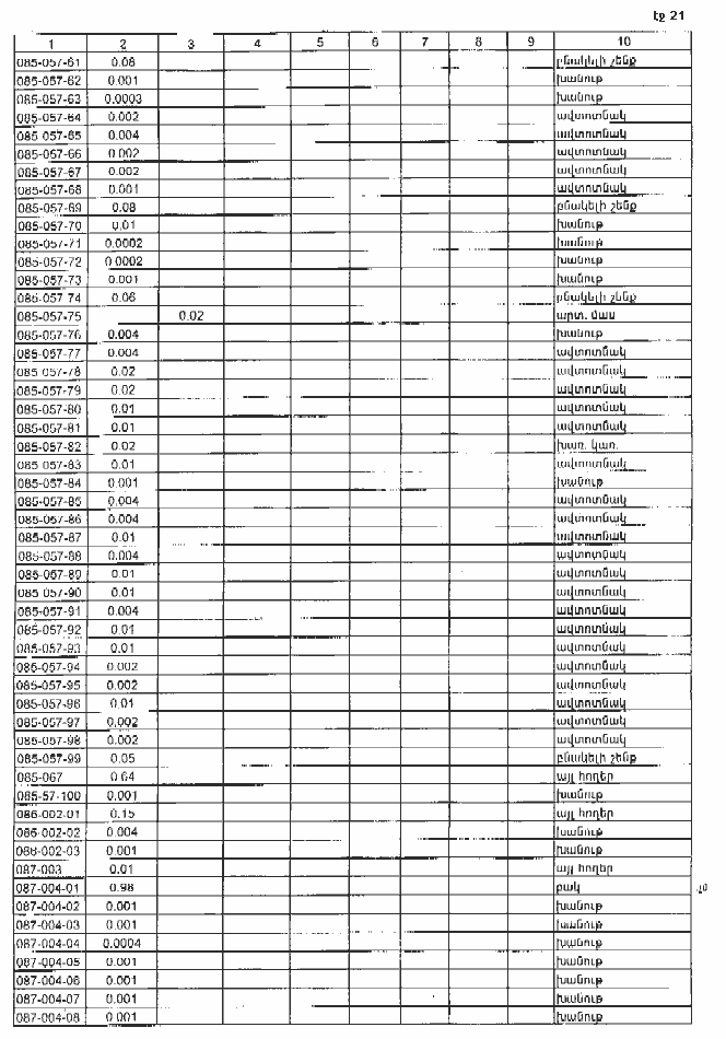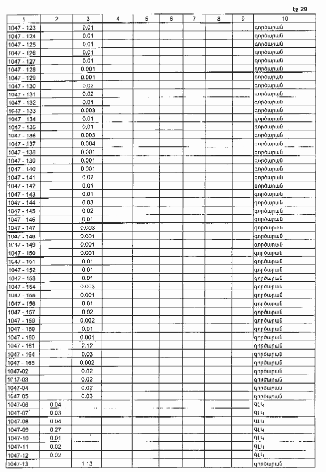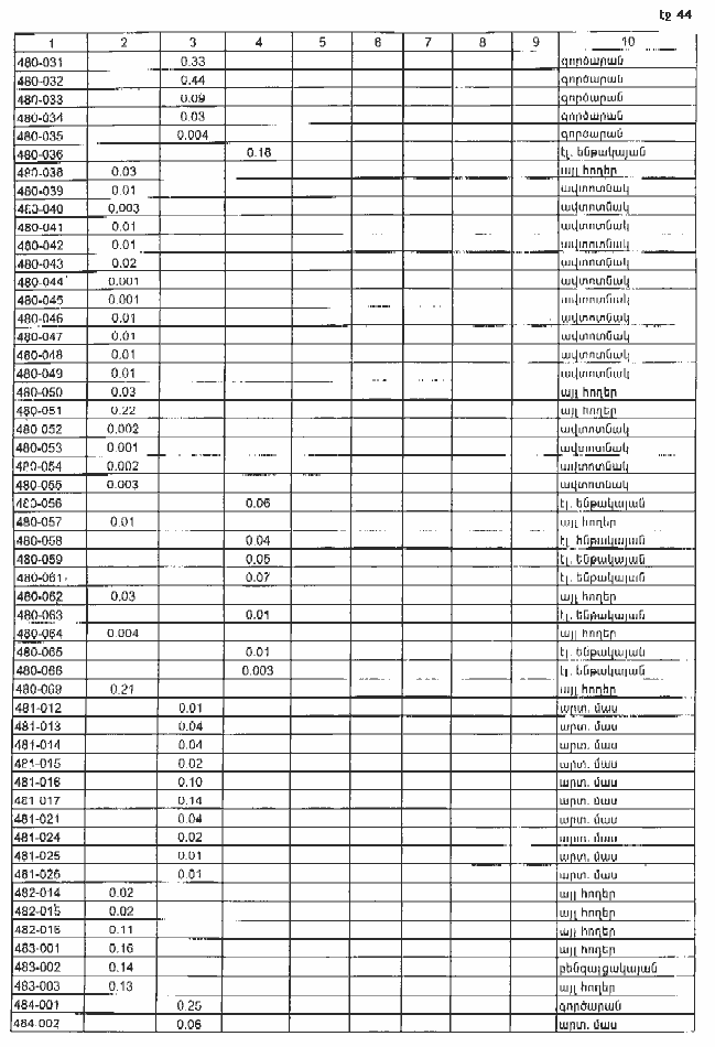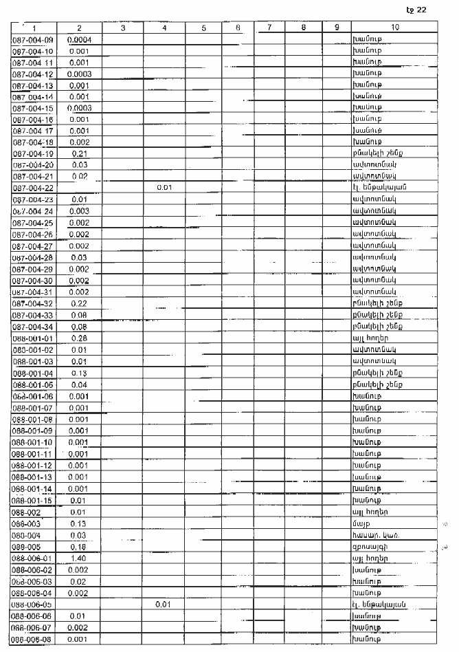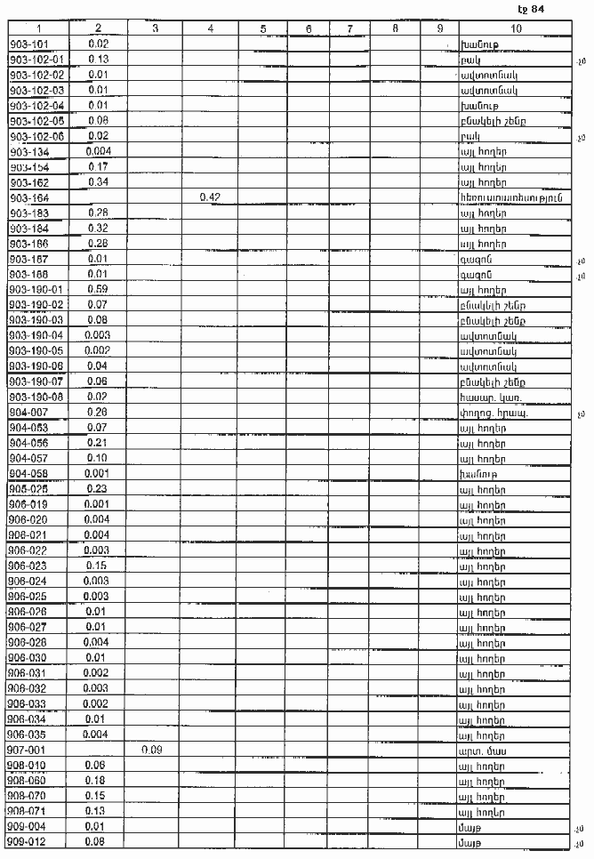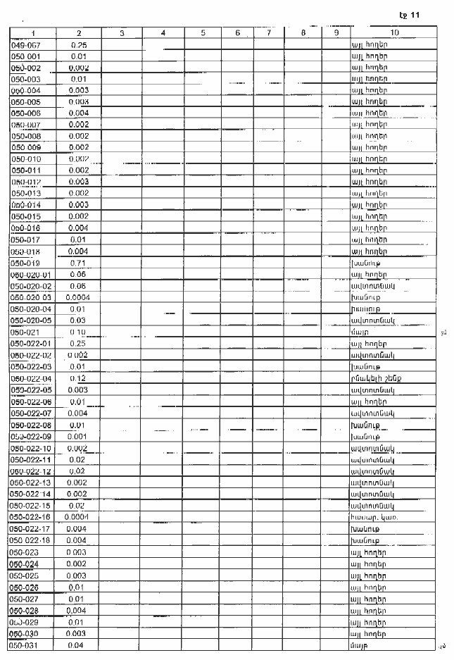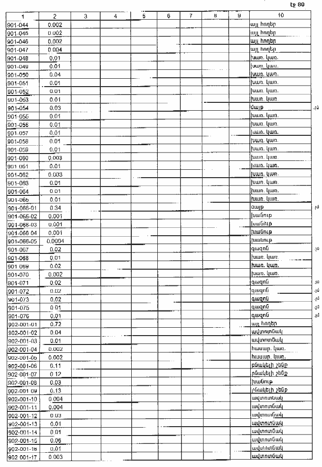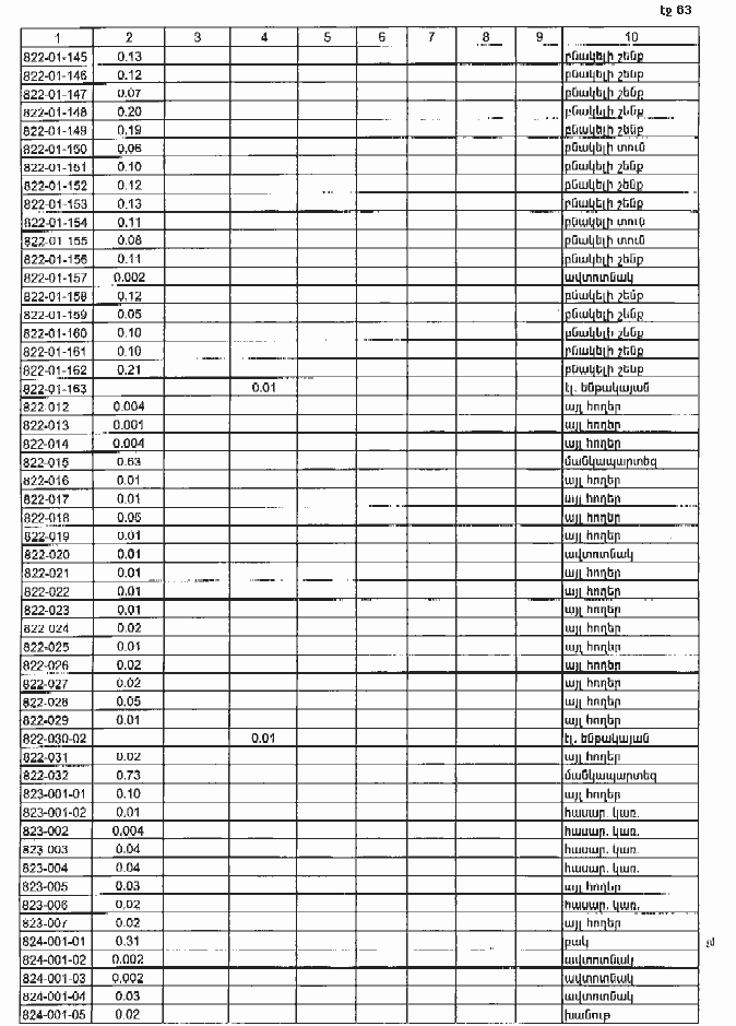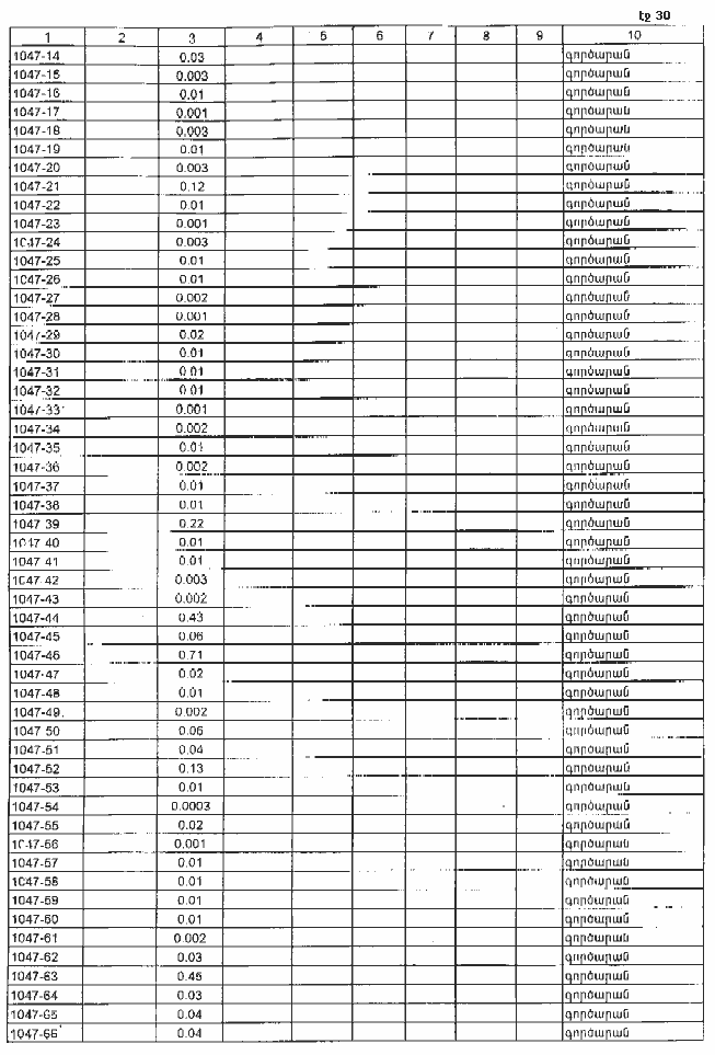 NN Նպա- Գործառական Ընդամենը Սեփականության սուբյեկտը ՀՀ քաղա- ՀՀ իրա- համայն- պետա- օտար- Ա Բ Գ 1 2 3 4 5 6 1.1 1. Գյուղա- վարելահող 2333.99 1925.87 282.90 125.22 1.2 բազմամյա տնկարկներ, 170.12 170.12 0.00 1.2.1 այդ թվում` 21.73 21.73 1.2.2 խաղողի այգի 148.39 148.39 1.2.3 այլ 1.3 խոտհարք 0.00 1.4 արոտ 1.5 այլ հողատեսքեր 1 ընդամենը 2504.11 2095.99 282.90 125.22 2.1 2. Բնակա- բնակելի կառուցապատման 430.00 430.00 2.1.1 այդ թվում` տնամերձ հողեր 430.00 430.00 2.1.2 այգեգործական 2.2 ընդհանուր օգտագործման 2.3 այլ հողեր 2 ընդամենը (2.1+2.2+2.3) 430.00 430.00 3 3. Արդյունաբերության, ընդերքօգտագործման և այլ 4 4. Էներգետիկայի, տրանսպորտի, կապի և կոմունալ ենթակառուցվածքների օբյեկտների 5 5. Հատուկ պահպանվող տարածքների 6 6. Հատուկ նշանակության 7.1 7. Անտառային անտառ 7.2 թփուտ 7.3 վարելահող 7.4 խոտհարք 7.5 արոտ 7.6 այլ հողեր 7 ընդամենը 8 8. Ջրային 9 9. Պահուստային ԸՆԴԱՄԵՆԸ` ՈՌՈԳՎՈՂ ՀՈՂԵՐ 2934.11 2525.99 282.90 125.22