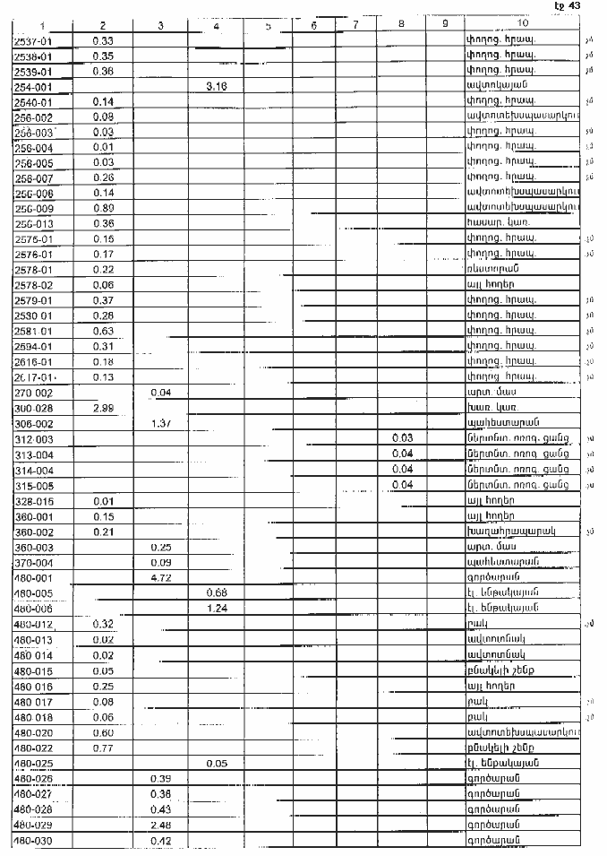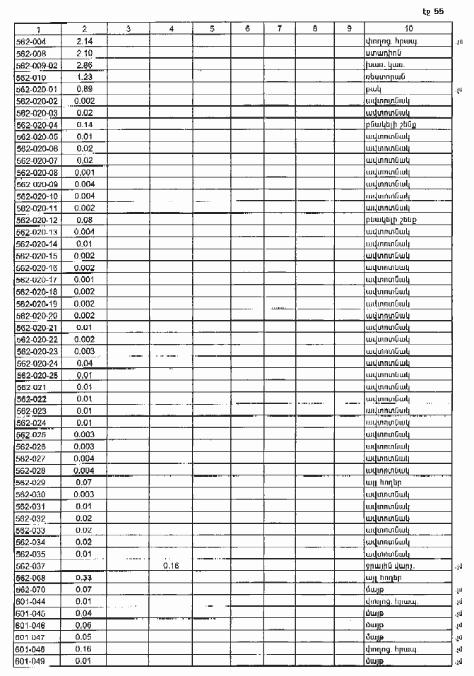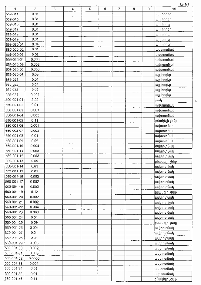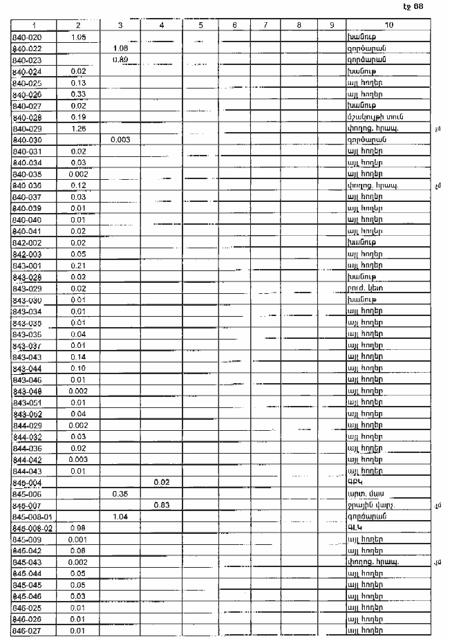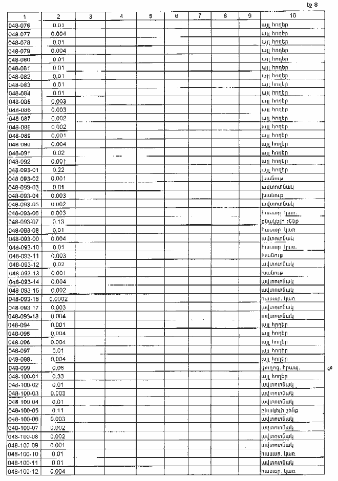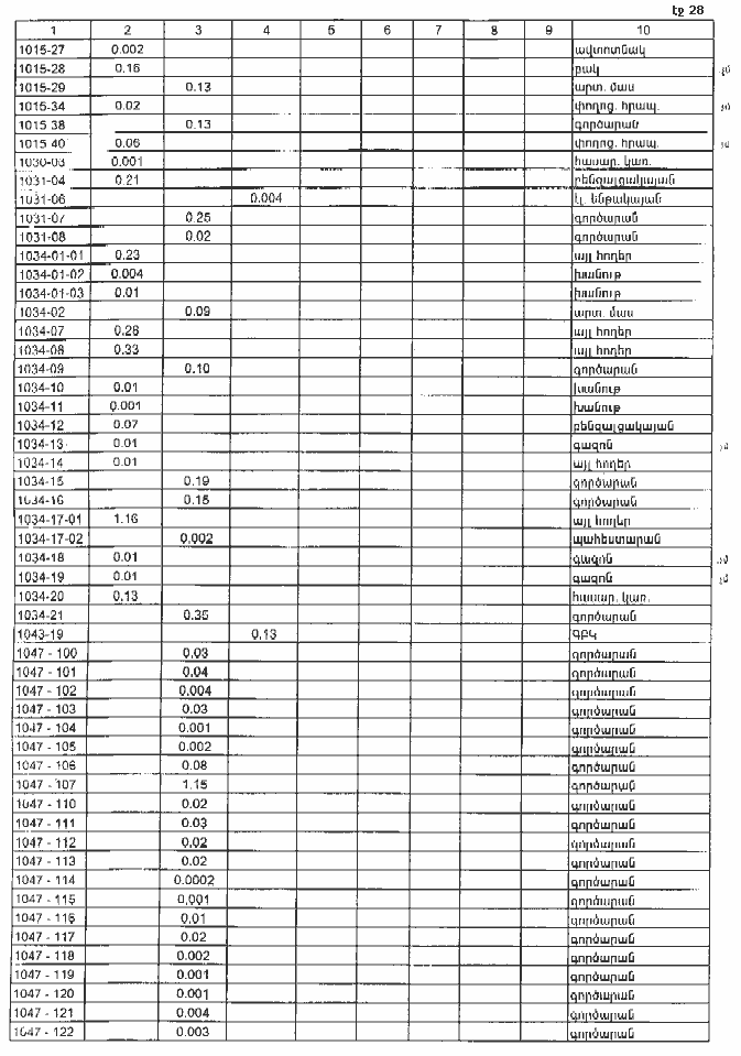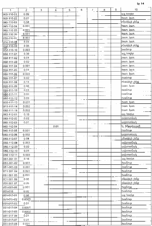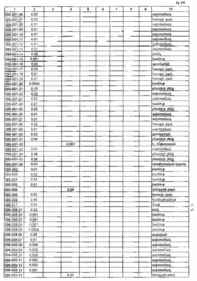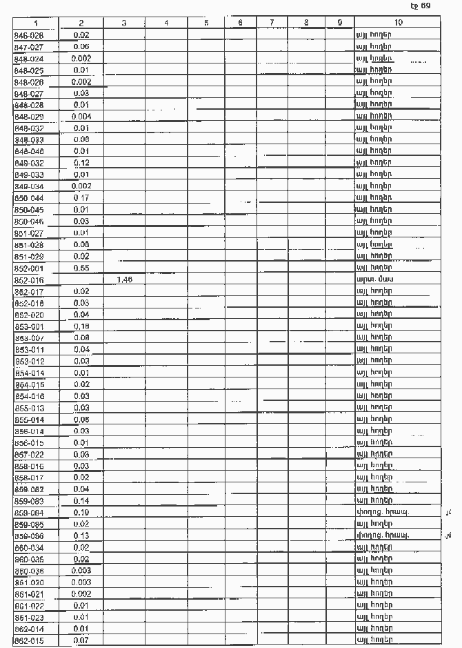 NN Նպա- Գործառական Ընդամենը Սեփականության սուբյեկտը ՀՀ քաղա- ՀՀ իրա- համայն- պետա- օտար- Ա Բ Գ 1 2 3 4 5 6 1.1 1. Գյուղա- վարելահող 2333.99 1925.87 282.90 125.22 1.2 բազմամյա տնկարկներ, 170.12 170.12 0.00 1.2.1 այդ թվում` 21.73 21.73 1.2.2 խաղողի այգի 148.39 148.39 1.2.3 այլ 1.3 խոտհարք 0.00 1.4 արոտ 1.5 այլ հողատեսքեր 1 ընդամենը 2504.11 2095.99 282.90 125.22 2.1 2. Բնակա- բնակելի կառուցապատման 430.00 430.00 2.1.1 այդ թվում` տնամերձ հողեր 430.00 430.00 2.1.2 այգեգործական 2.2 ընդհանուր օգտագործման 2.3 այլ հողեր 2 ընդամենը (2.1+2.2+2.3) 430.00 430.00 3 3. Արդյունաբերության, ընդերքօգտագործման և այլ 4 4. Էներգետիկայի, տրանսպորտի, կապի և կոմունալ ենթակառուցվածքների օբյեկտների 5 5. Հատուկ պահպանվող տարածքների 6 6. Հատուկ նշանակության 7.1 7. Անտառային անտառ 7.2 թփուտ 7.3 վարելահող 7.4 խոտհարք 7.5 արոտ 7.6 այլ հողեր 7 ընդամենը 8 8. Ջրային 9 9. Պահուստային ԸՆԴԱՄԵՆԸ` ՈՌՈԳՎՈՂ ՀՈՂԵՐ 2934.11 2525.99 282.90 125.22