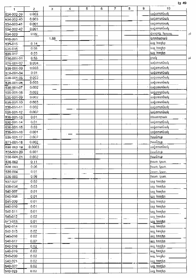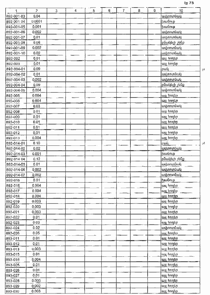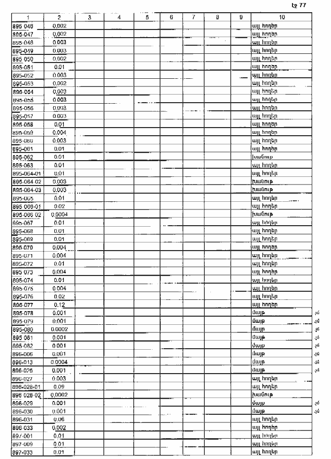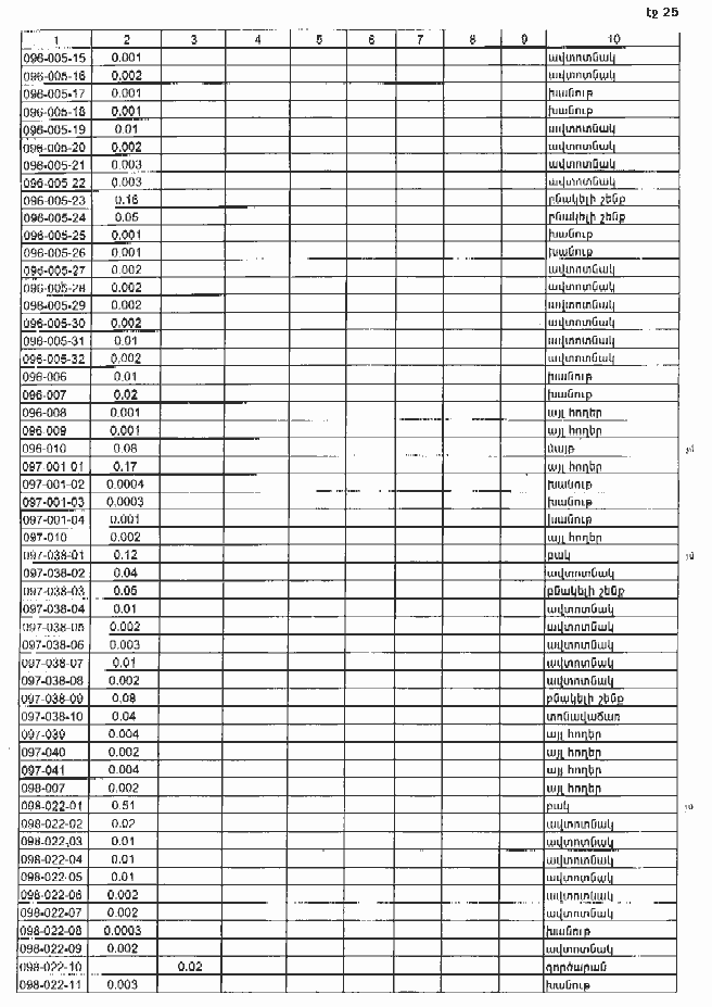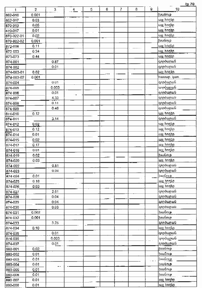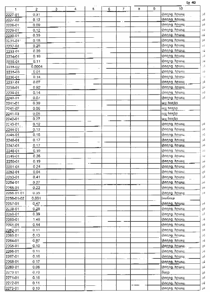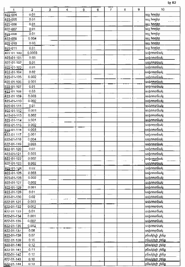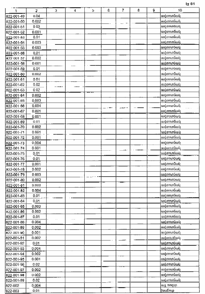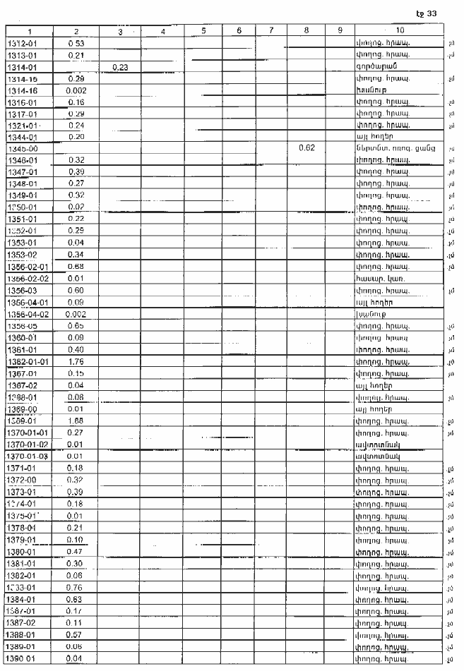 NN Նպա- Գործառական Ընդամենը Սեփականության սուբյեկտը ՀՀ քաղա- ՀՀ իրա- համայն- պետա- օտար- Ա Բ Գ 1 2 3 4 5 6 1.1 1. Գյուղա- վարելահող 2333.99 1925.87 282.90 125.22 1.2 բազմամյա տնկարկներ, 170.12 170.12 0.00 1.2.1 այդ թվում` 21.73 21.73 1.2.2 խաղողի այգի 148.39 148.39 1.2.3 այլ 1.3 խոտհարք 0.00 1.4 արոտ 1.5 այլ հողատեսքեր 1 ընդամենը 2504.11 2095.99 282.90 125.22 2.1 2. Բնակա- բնակելի կառուցապատման 430.00 430.00 2.1.1 այդ թվում` տնամերձ հողեր 430.00 430.00 2.1.2 այգեգործական 2.2 ընդհանուր օգտագործման 2.3 այլ հողեր 2 ընդամենը (2.1+2.2+2.3) 430.00 430.00 3 3. Արդյունաբերության, ընդերքօգտագործման և այլ 4 4. Էներգետիկայի, տրանսպորտի, կապի և կոմունալ ենթակառուցվածքների օբյեկտների 5 5. Հատուկ պահպանվող տարածքների 6 6. Հատուկ նշանակության 7.1 7. Անտառային անտառ 7.2 թփուտ 7.3 վարելահող 7.4 խոտհարք 7.5 արոտ 7.6 այլ հողեր 7 ընդամենը 8 8. Ջրային 9 9. Պահուստային ԸՆԴԱՄԵՆԸ` ՈՌՈԳՎՈՂ ՀՈՂԵՐ 2934.11 2525.99 282.90 125.22
