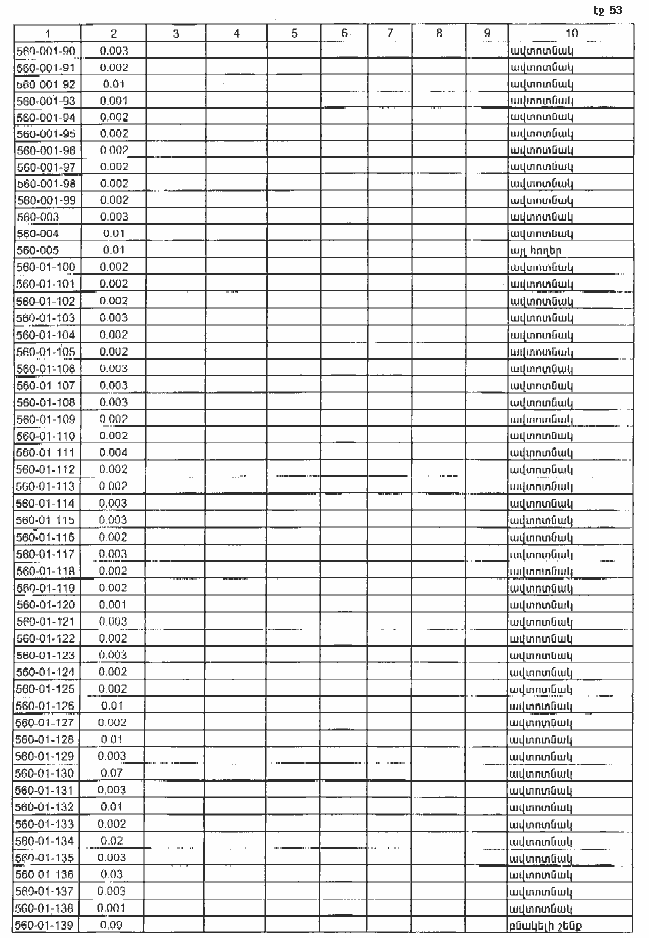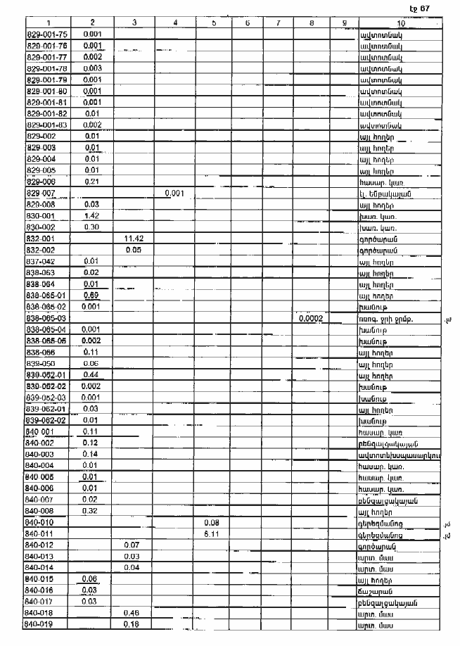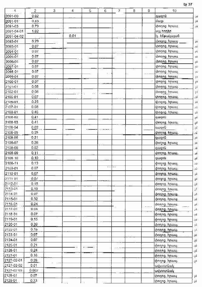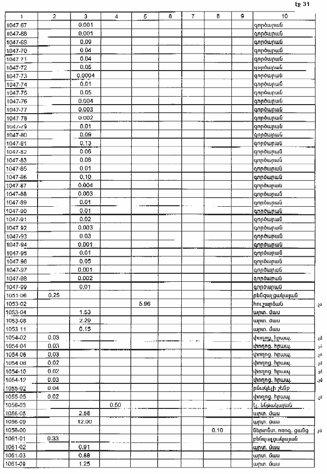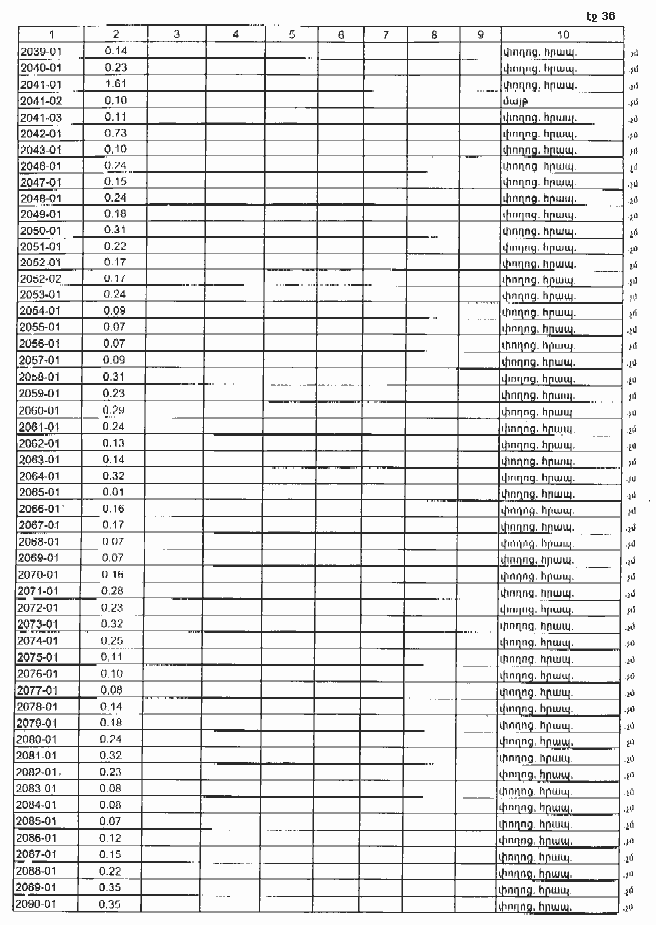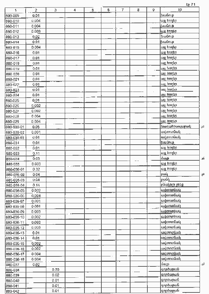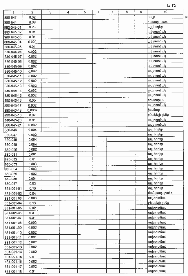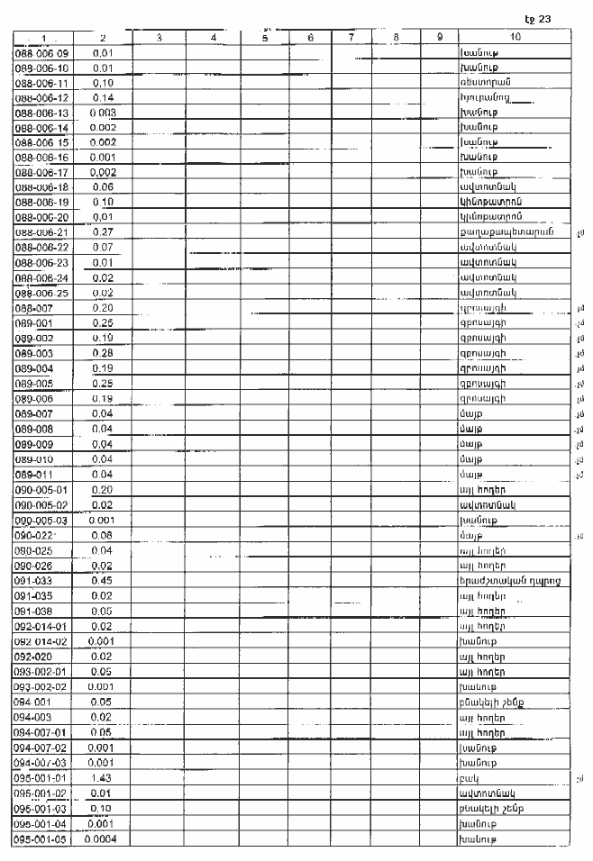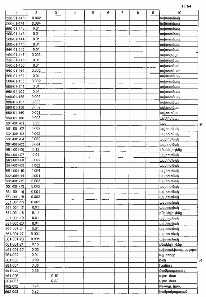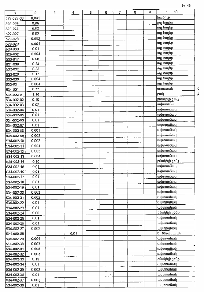 NN Նպա- Գործառական Ընդամենը Սեփականության սուբյեկտը ՀՀ քաղա- ՀՀ իրա- համայն- պետա- օտար- Ա Բ Գ 1 2 3 4 5 6 1.1 1. Գյուղա- վարելահող 2333.99 1925.87 282.90 125.22 1.2 բազմամյա տնկարկներ, 170.12 170.12 0.00 1.2.1 այդ թվում` 21.73 21.73 1.2.2 խաղողի այգի 148.39 148.39 1.2.3 այլ 1.3 խոտհարք 0.00 1.4 արոտ 1.5 այլ հողատեսքեր 1 ընդամենը 2504.11 2095.99 282.90 125.22 2.1 2. Բնակա- բնակելի կառուցապատման 430.00 430.00 2.1.1 այդ թվում` տնամերձ հողեր 430.00 430.00 2.1.2 այգեգործական 2.2 ընդհանուր օգտագործման 2.3 այլ հողեր 2 ընդամենը (2.1+2.2+2.3) 430.00 430.00 3 3. Արդյունաբերության, ընդերքօգտագործման և այլ 4 4. Էներգետիկայի, տրանսպորտի, կապի և կոմունալ ենթակառուցվածքների օբյեկտների 5 5. Հատուկ պահպանվող տարածքների 6 6. Հատուկ նշանակության 7.1 7. Անտառային անտառ 7.2 թփուտ 7.3 վարելահող 7.4 խոտհարք 7.5 արոտ 7.6 այլ հողեր 7 ընդամենը 8 8. Ջրային 9 9. Պահուստային ԸՆԴԱՄԵՆԸ` ՈՌՈԳՎՈՂ ՀՈՂԵՐ 2934.11 2525.99 282.90 125.22