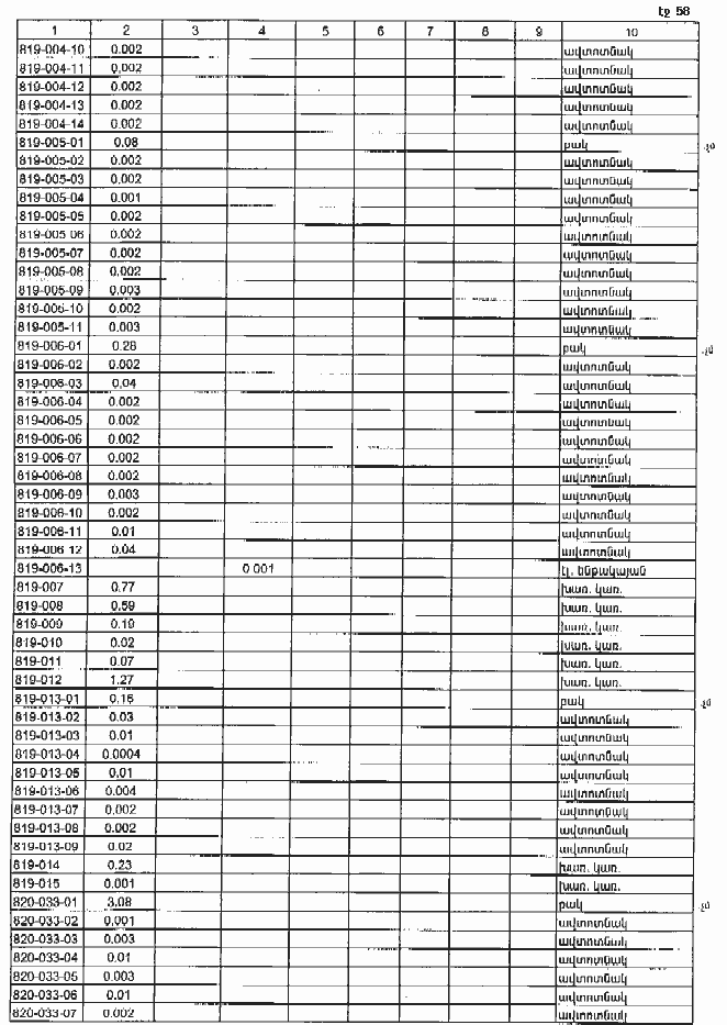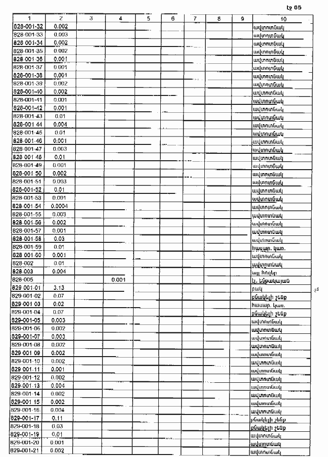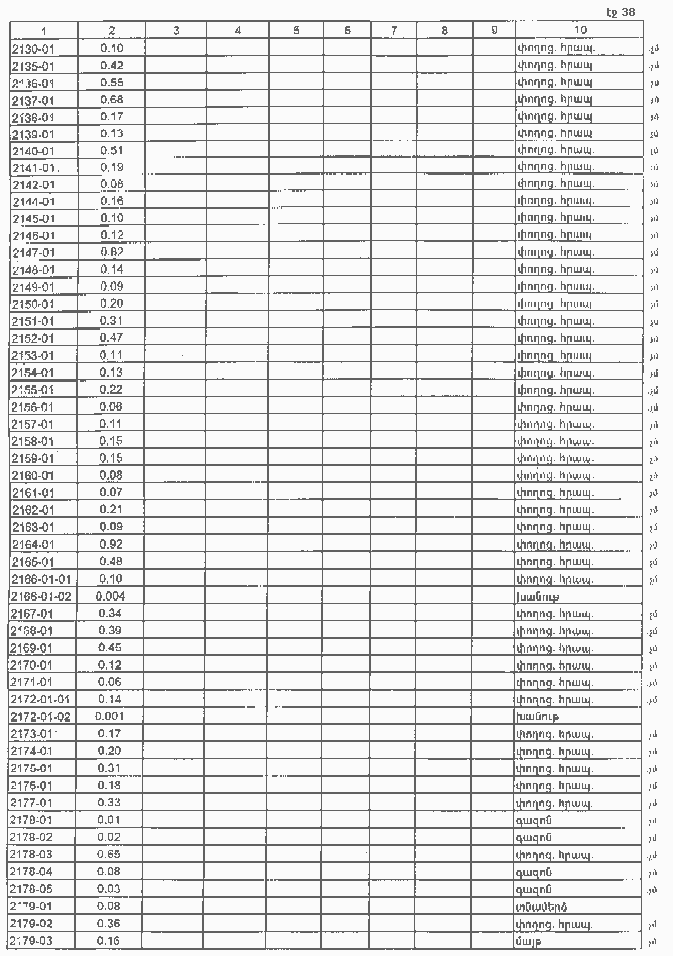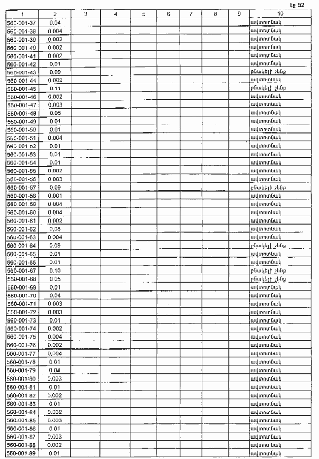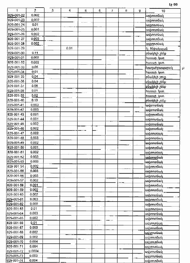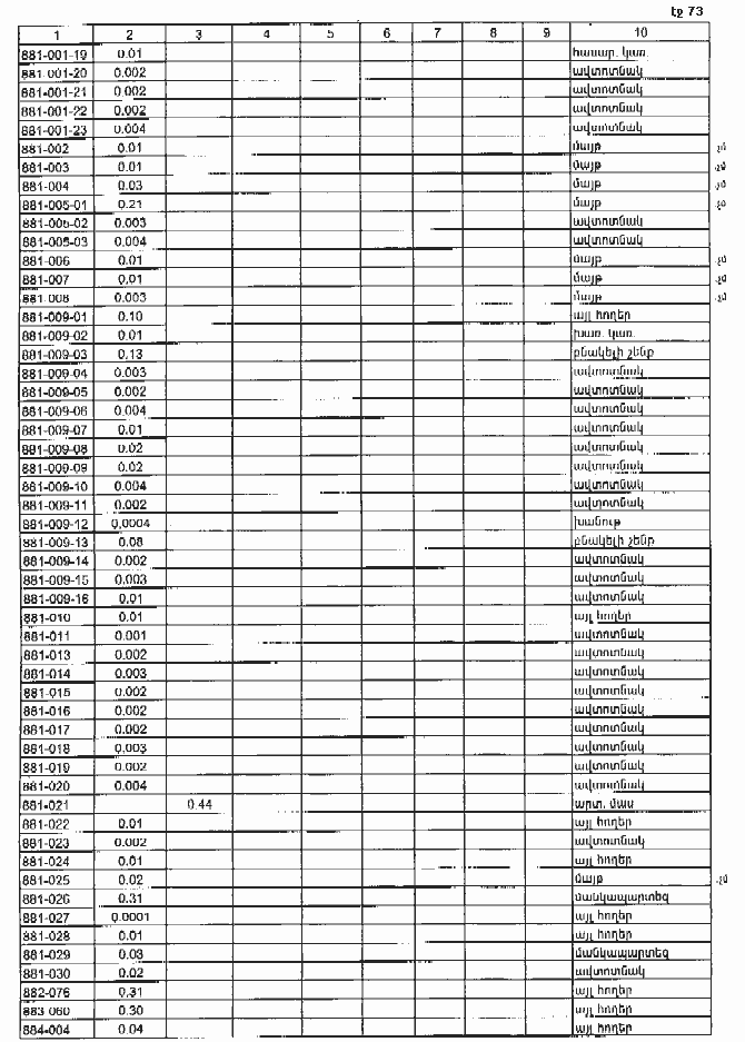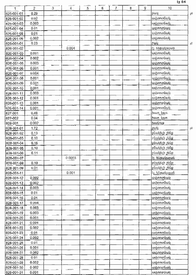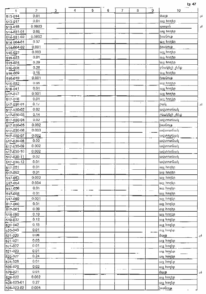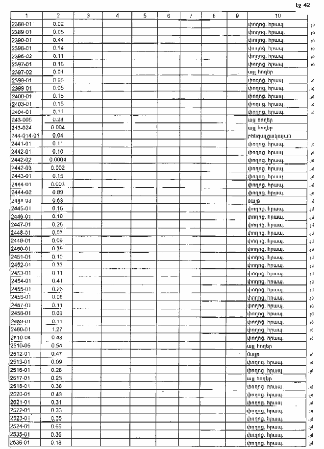 NN Նպա- Գործառական Ընդամենը Սեփականության սուբյեկտը ՀՀ քաղա- ՀՀ իրա- համայն- պետա- օտար- Ա Բ Գ 1 2 3 4 5 6 1.1 1. Գյուղա- վարելահող 2333.99 1925.87 282.90 125.22 1.2 բազմամյա տնկարկներ, 170.12 170.12 0.00 1.2.1 այդ թվում` 21.73 21.73 1.2.2 խաղողի այգի 148.39 148.39 1.2.3 այլ 1.3 խոտհարք 0.00 1.4 արոտ 1.5 այլ հողատեսքեր 1 ընդամենը 2504.11 2095.99 282.90 125.22 2.1 2. Բնակա- բնակելի կառուցապատման 430.00 430.00 2.1.1 այդ թվում` տնամերձ հողեր 430.00 430.00 2.1.2 այգեգործական 2.2 ընդհանուր օգտագործման 2.3 այլ հողեր 2 ընդամենը (2.1+2.2+2.3) 430.00 430.00 3 3. Արդյունաբերության, ընդերքօգտագործման և այլ 4 4. Էներգետիկայի, տրանսպորտի, կապի և կոմունալ ենթակառուցվածքների օբյեկտների 5 5. Հատուկ պահպանվող տարածքների 6 6. Հատուկ նշանակության 7.1 7. Անտառային անտառ 7.2 թփուտ 7.3 վարելահող 7.4 խոտհարք 7.5 արոտ 7.6 այլ հողեր 7 ընդամենը 8 8. Ջրային 9 9. Պահուստային ԸՆԴԱՄԵՆԸ` ՈՌՈԳՎՈՂ ՀՈՂԵՐ 2934.11 2525.99 282.90 125.22