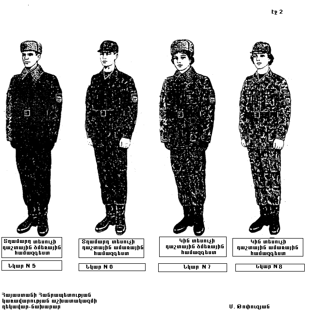 դաշտային կոստյում` բամբակյա մուգ կանաչ գույնի գործվածքից, տրիկոտաժե կիսաթև շապիկով, կեպիով (N 3 հավելված, նկարներ NN 6 և 8),