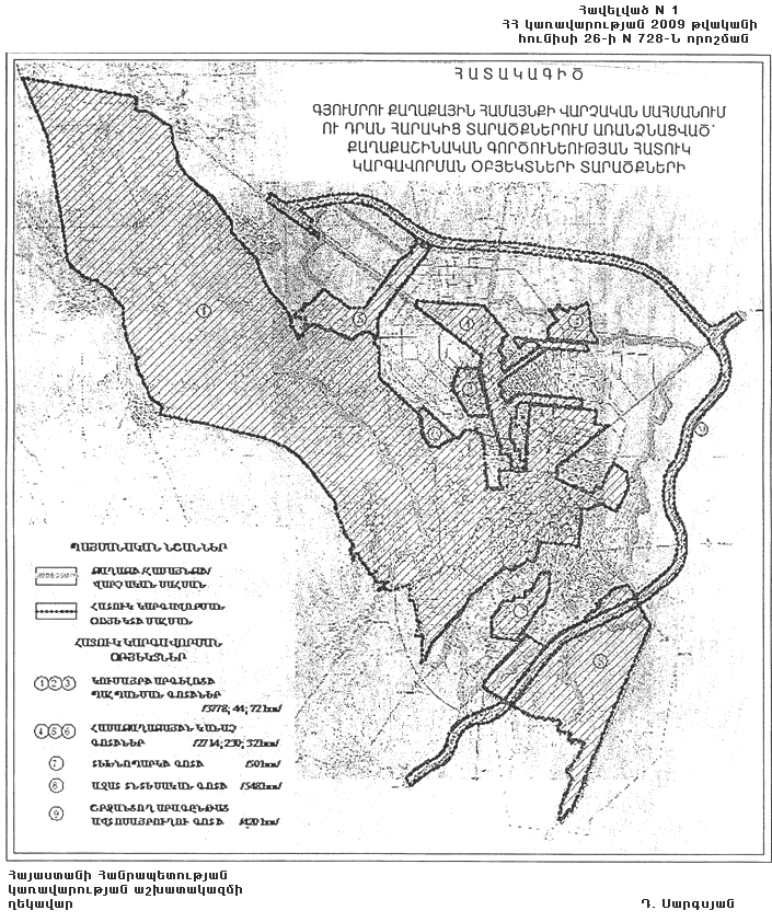 1) Գյումրու քաղաքային համայնքի վարչական սահմանում ու դրան հարակից տարածքներում առանձնացվող` քաղաքաշինական գործունեության հատուկ կարգավորման օբյեկտների տարածքները՝ համաձայն N 1 հավելվածի.