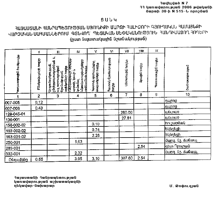 7. Հայաստանի Հանրապետության Սյունիքի մարզպետին` Հայաստանի Հանրապետության կառավարության 2000 թվականի հոկտեմբերի 23-ի N 656 որոշմամբ սահմանված կարգով` սկզբնական հաշվառման տվյալների հիման վրա ապահովել մարզի տարածքում ընթացիկ հաշվառման աշխատանքների իրականացումը: