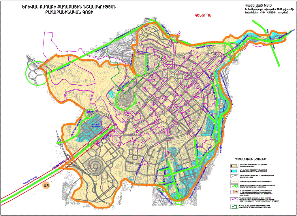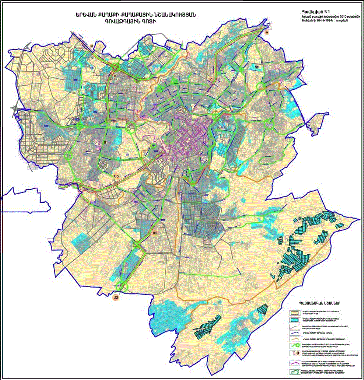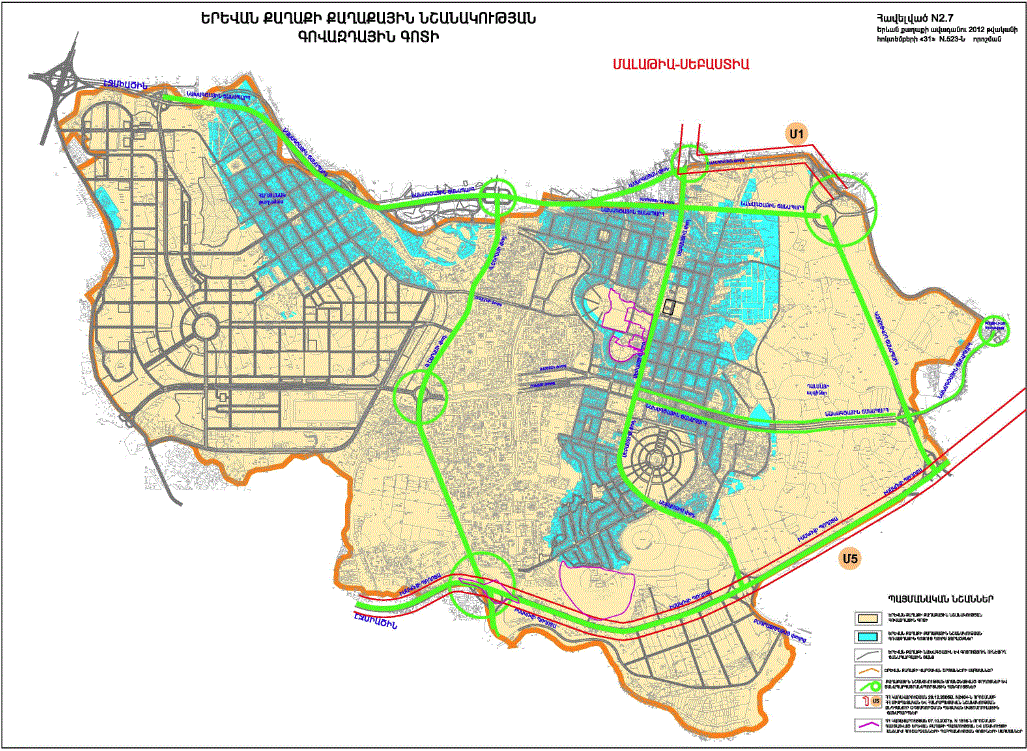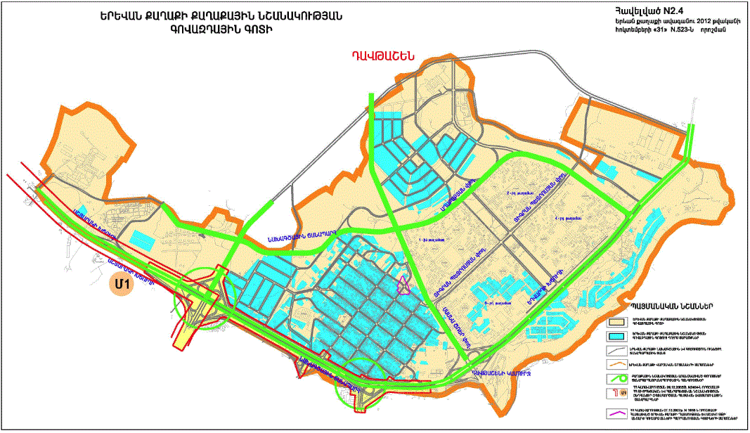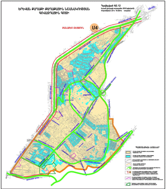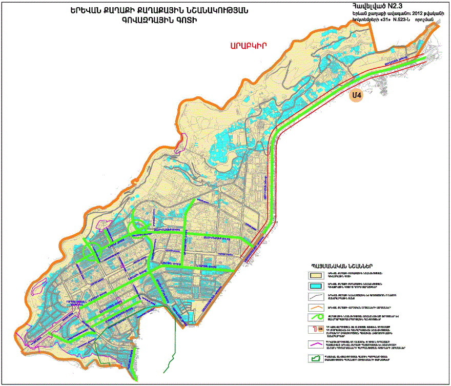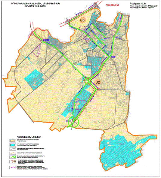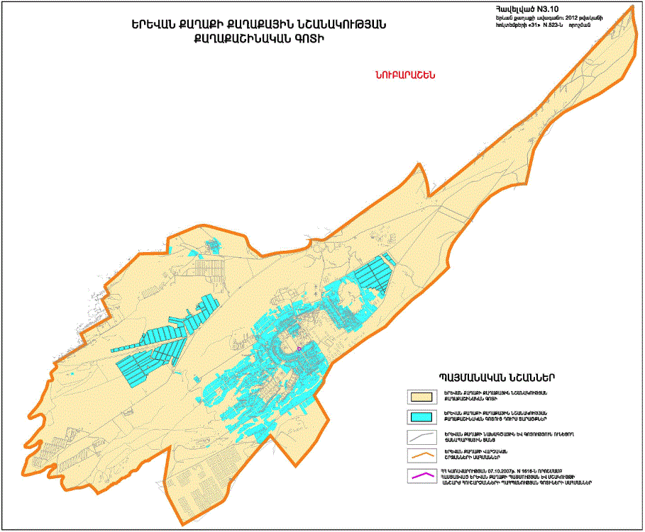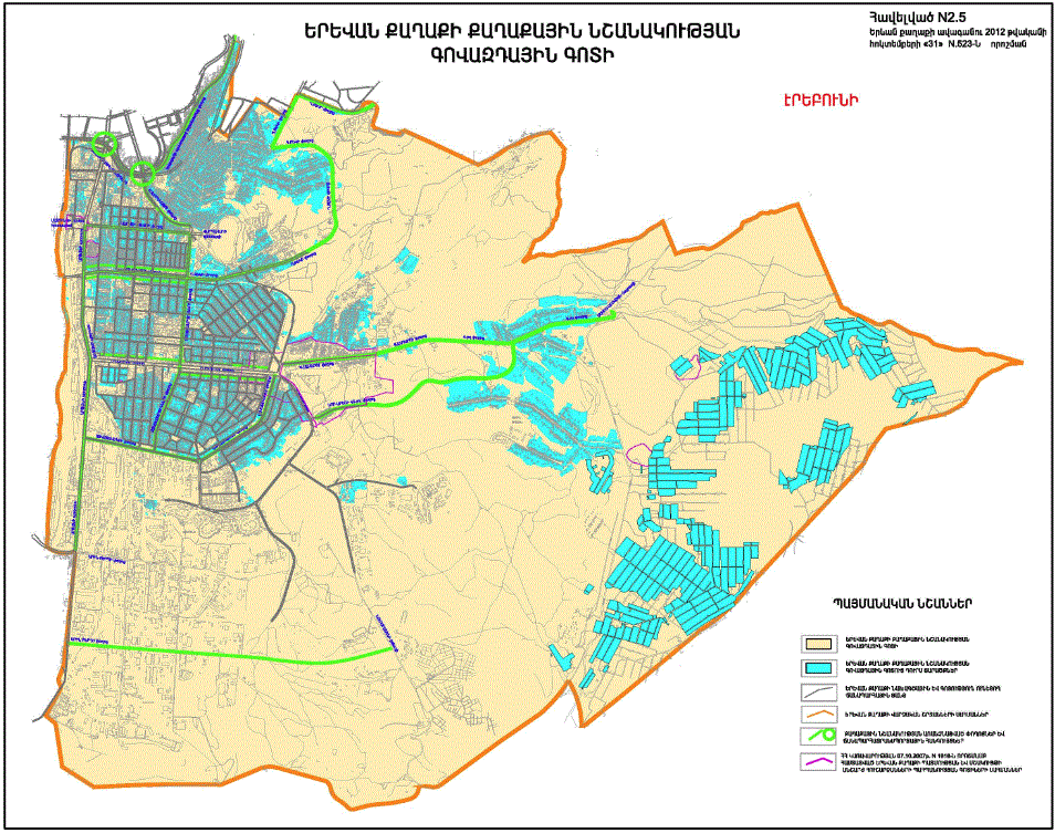 o Կ.Ուլնեցու, Բաբայան փողոցներով և երկաթգծով պարփակված նախագծային թաղամասի որոշ հատվածներում կառուցապատման հատուկ ռեժիմի գոտի /Ա և Բ հատվածներով/ o Կ.Ուլնեցու, Բաբայան և Տիգրանյան փողոցների միջանկյալ հատվածի աջ և ձախ կողմերում գտնվող կառույցների վերակառուցման դեպքում հարկայնության սահմանափակման գոտի |