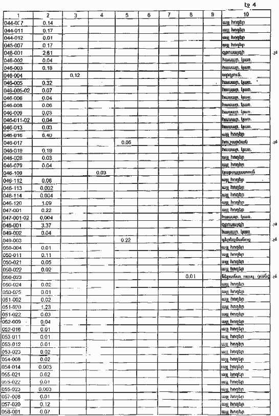 4. Ընդունել ի գիտություն Հայաստանի Հանրապետության Կոտայքի մարզի Հրազդանի քաղաքային համայնքի հողային ֆոնդի առկայության և բաշխման մասին հաշվետվությունը՝ 2005 թվականի հունվարի 1-ի դրությամբ՝ համաձայն NN 8 և 9 հավելվածների: