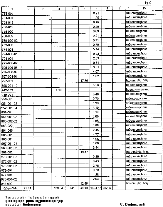 6. Թույլատրել Հայաստանի Հանրապետության կառավարությանն առընթեր անշարժ գույքի կադաստրի պետական կոմիտեի նախագահին Հայաստանի Հանրապետության պետական գեոդեզիական ցանցի հավասարակշռման արդյունքների հիման վրա Հայաստանի Հանրապետության վարչատարածքային միավորների սահմանանիշերի կոորդինատների ժողովածուի հրատարակումից հետո հողային ֆոնդի ընթացիկ հաշվառման ժամանակ Հայաստանի Հանրապետության Կոտայքի մարզի Հրազդանի քաղաքային համայնքի հողային հաշվեկշռում սահմանված կարգով կատարել համապատասխան փոփոխություններ: