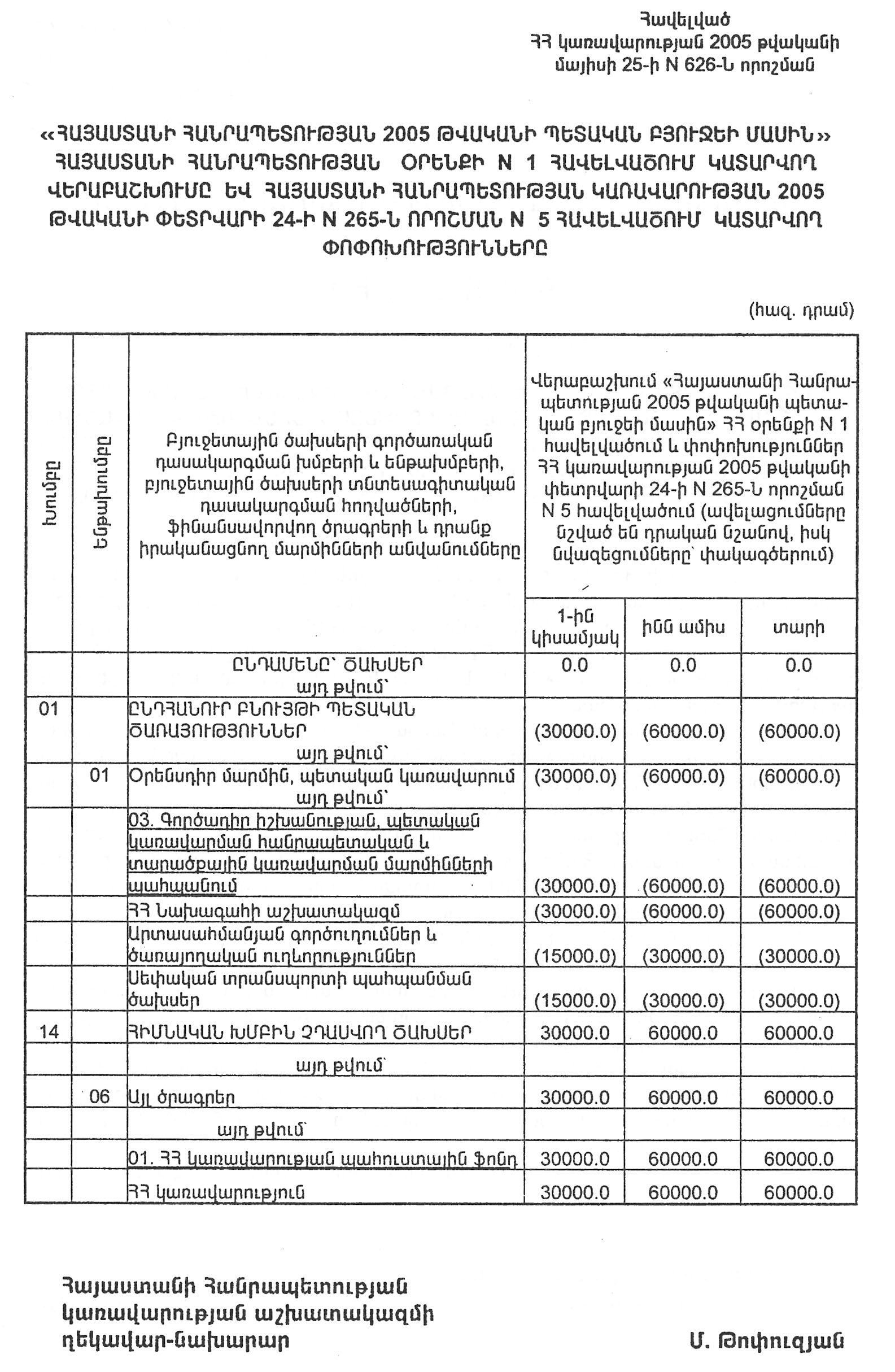 «ՀԱՅԱՍՏԱՆԻ ՀԱՆՐԱՊԵՏՈՒԹՅԱՆ 2005 ԹՎԱԿԱՆԻ ՊԵՏԱԿԱՆ ԲՅՈՒՋԵԻ ՄԱՍԻՆ» ՀԱՅԱՍՏԱՆԻ ՀԱՆՐԱՊԵՏՈՒԹՅԱՆ ՕՐԵՆՔՈՒՄ ՎԵՐԱԲԱՇԽՈՒՄ, ՀԱՅԱՍՏԱՆԻ ՀԱՆՐԱՊԵՏՈՒԹՅԱՆ ԿԱՌԱՎԱՐՈՒԹՅԱՆ 2005 ԹՎԱԿԱՆԻ ՓԵՏՐՎԱՐԻ 24-Ի N 265-Ն ՈՐՈՇՄԱՆ ՄԵՋ ՓՈՓՈԽՈՒԹՅՈՒՆՆԵՐ ԵՎ ՀԱՅԱՍՏԱՆԻ ՀԱՆՐԱՊԵՏՈՒԹՅԱՆ 2005 ԹՎԱԿԱՆԻ ՊԵՏԱԿԱՆ ԲՅՈՒՋԵԻՑ ԳՈՒՄԱՐ ՀԱՏԿԱՑՆԵԼՈՒ ՄԱՍԻՆ