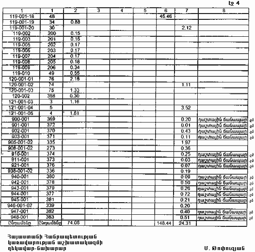4. Ընդունել ի գիտություն Հայաստանի Հանրապետության Գեղարքունիքի մարզի Ձորավանքի գյուղական համայնքի հողային ֆոնդի առկայության և բաշխման մասին հաշվետվությունը՝ 2005 թվականի հունվարի 1-ի դրությամբ՝ համաձայն NN 8 և 9 հավելվածների:
