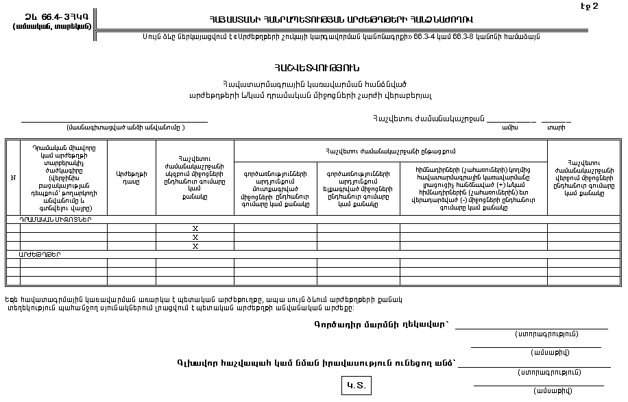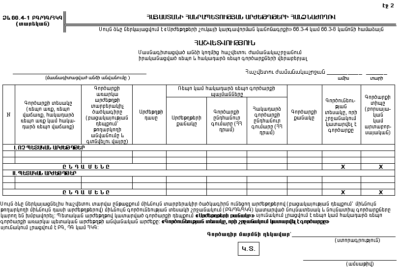 (բ) 66.3-4(դ) և 66.3-8(բ)(3) կանոններում «հաշվետվության» բառերից հետո լրացնել «66.4-1ԲԳ/ԴԳ/ՀԿԳ,» բառերը.