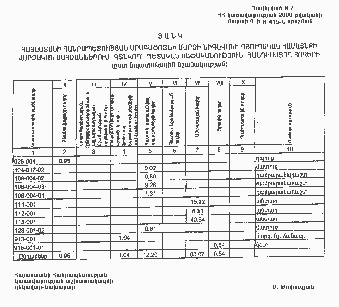 7. Հայաստանի Հանրապետության Արագածոտնի մարզպետին՝ Հայաստանի Հանրապետության կառավարության 2000 թվականի հոկտեմբերի 23-ի N 656 որոշմամբ սահմանված կարգով՝ սկզբնական հաշվառման տվյալների հիման վրա ապահովել մարզի տարածքում ընթացիկ հաշվառման աշխատանքների իրականացումը: