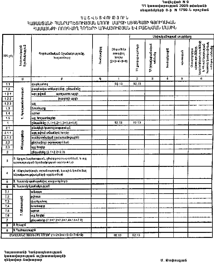 Հայաստանի Հանրապետության Մ. Թոփուզյան Հավելված N 9